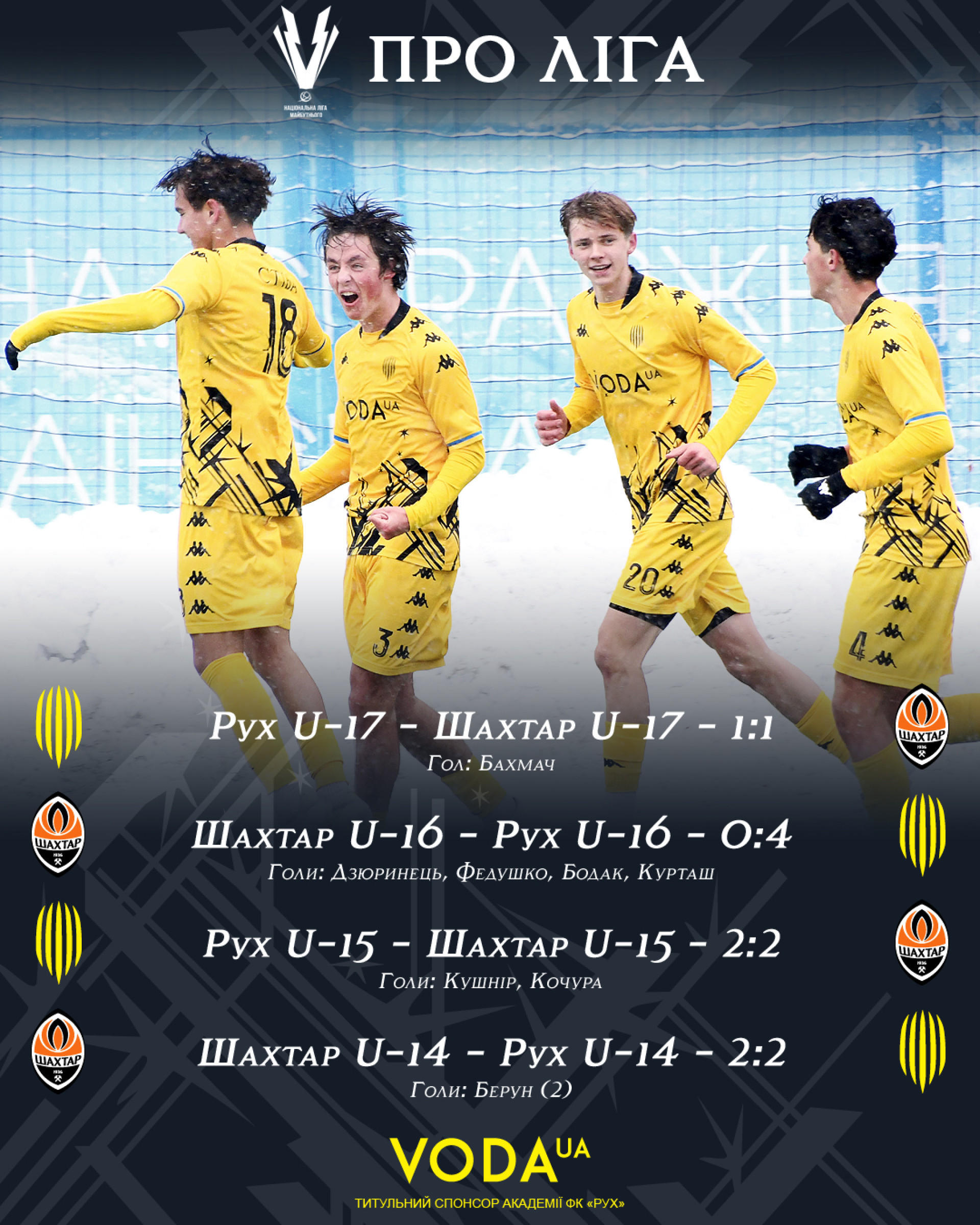 Тим часом «Рух» U-16 на виїзді розгромив «Шахтар» з рахунком 4:0. Забитими м’ячами відзначились Дзюринець, Федушко, Бодак і Курташ.
