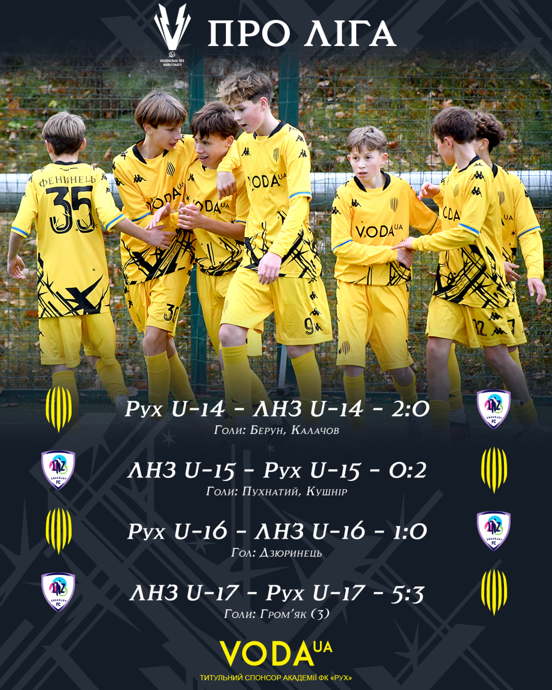 Водночас в іншій домашній грі «Рух» U-14 здобув звитягу над однолітками з ЛНЗ із рахунком 2:0. Забитими м’ячами відзначились Берун та Калачов.